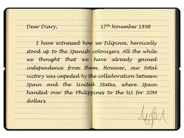 An open notebook with a handwritten letter on the left page and a handwritten note on the right page. The left page has a letterhead with the date '17 November 1898' and the name 'J. M. B.' at the top. The letter is addressed to 'Dear Sir' and begins with the phrase 'Dear Diary'. The right page has a handwritten note that starts with 'I have witnessed how we Filipinos, heroically stood up to the Spanish colonizers, all the while we thought that we have already gained our independence from them however, our victory was impeded by the collaboration between Spain and the United States | Dear Diary,\n\n17th November 1898\n\nI have witnessed how we Filipinos, heroically\nstood up to the Spanish colonizers. All the... | 8696bbbfae1de60c523e9ba5d0fef77fa8f5b7d1ec53a53d0dac265da0362ed1 | 001229741059 | 0 | 0 | 105 | 17 | 0 | 0 | |