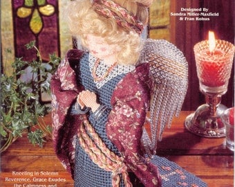 A detailed illustration of a doll with blonde hair, wearing a blue dress with a floral pattern, a lace collar, and a shawl draped over the shoulders. The doll is seated on a wooden surface, with a lit candle in a red holder to the right and a potted plant with green leaves to the left. The background features a stained glass window with a design of a cross and a heart. | Heavenly Messengers GRACE ~ plastic canvas book | 1e14e4e430392bf076d7774d8724f4146bd47d83c876e4ac1db121120ea5652e | 001229740991 | 0 | 0 | 72 | 7 | 0 | 0 | |