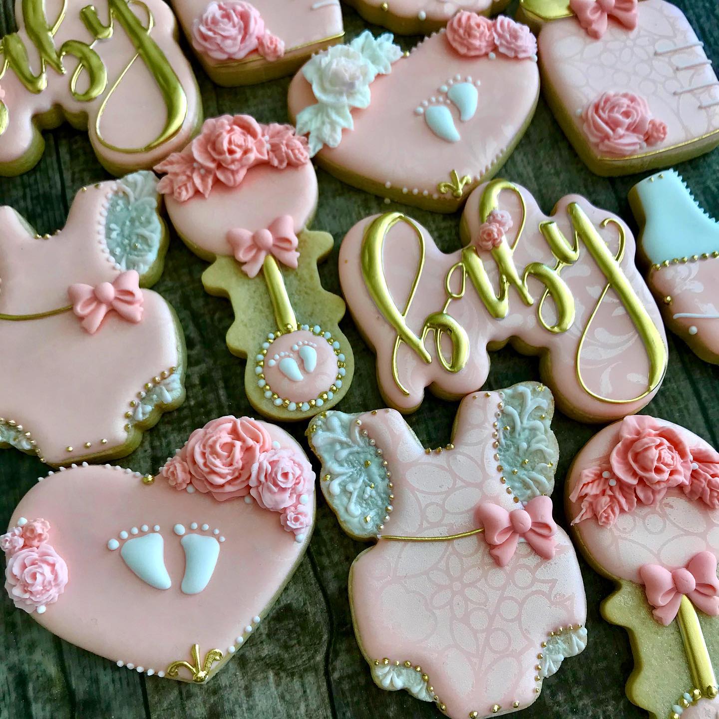 A collection of pink and white heart-shaped cookies with various designs and decorations. Some cookies have a floral pattern, while others feature baby-themed designs such as baby feet, a baby's face, and the word 'baby' written in cursive. The cookies are arranged on a wooden surface, and some have gold accents. | Baby Girl Shower Decorated Cookies | 25f4630512e8258224a08d685d72a0b4d20d8bb50d6f9293746f0f38aff1885b | 001229741090 | 0 | 0 | 51 | 5 | 0 | 0 | |