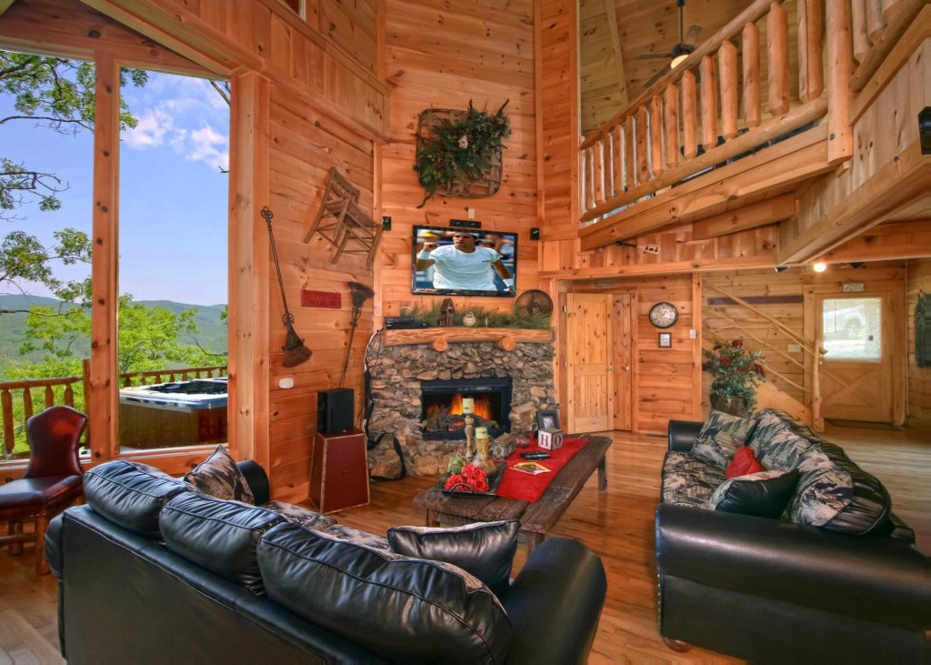 A cozy living room with a stone fireplace, wooden walls, and a large window overlooking a scenic view. The room is furnished with a black leather couch, a red and black patterned chair, and a wooden coffee table. There are various decorative items such as a clock, a framed picture, and a vase on the mantelpiece. A flat-screen TV is mounted on the wall above the fireplace. | Photo of a Pigeon Forge Cabin named Livin The Dream #44 - This is the third photo in the set. | 2a0d8389f7a941f79c5fdc032278c5a33e53ebe6bb77103069a14b5ac4978c2c | 001229741547 | 0 | 0 | 67 | 20 | 0 | 0 | |