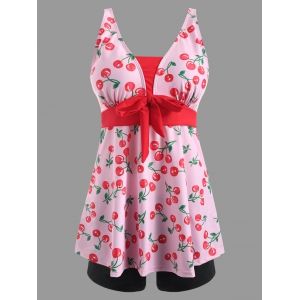 A pink dress with a floral pattern featuring red cherries and green leaves is displayed on a mannequin. The dress has a halter neck design with a red ribbon tied at the back. The mannequin is wearing a black bra underneath the dress. | Cherry Print Plunge Neck Tankini Swimsuit - | 593f8d5d89bc018c52688c1ba68b575733e8d43c6918063ec6855ab39ff86b99 | 001229741449 | 0 | 0 | 43 | 7 | 0 | 0 | |