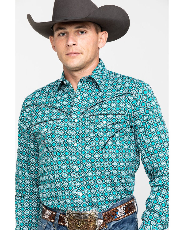 A man wearing a blue patterned shirt with a cowboy hat and a brown leather belt with a silver buckle. | Rock 47 By Wrangler Men's Teal Geo Print Long Sleeve Western Shirt , Teal, hi-res | 0b97f13bc528f21637b865da4fd554691ca216e9606c1564abb2084a913c92b0 | 001229741471 | 0 | 0 | 20 | 15 | 0 | 0 | |