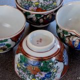 A collection of four ceramic bowls with intricate floral designs and a glossy finish. The bowls are arranged in a square formation, with each bowl slightly overlapping the one next to it. The largest bowl is in the center, surrounded by three smaller bowls, one on each side and one in the front. The bowls have a variety of colors, including shades of blue, green, and orange, with white and gold accents. The designs feature a mix of flowers, leaves, and abstract patterns. | Showa Period Tea Ceremony Teaset | b566ba9c083b33af186478fbc38f73cb405c48dcb15a564f4492369e2200baf2 | 001229741399 | 0 | 0 | 83 | 5 | 0 | 0 | |