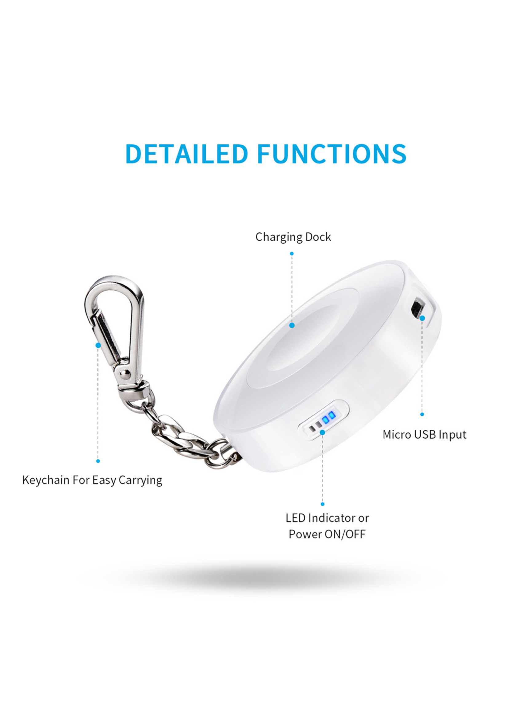 A white portable charger with a blue LED indicator is connected to a silver chain. The charger has a micro USB port and a power button. The image includes detailed annotations explaining the functions of the charger, such as 'charging dock', 'keychain for easy carrying', 'LED indicator or power on/off', and'micro USB port'. | Choetech Powerbank 900mAh MFI for Apple Watch - Keychain | b9bc483446324b9a34fbb784ec7670b2973824efb72da1fcc1ca24bed2be9a2c | 001229741862 | 0 | 0 | 53 | 9 | 0 | 0 | |