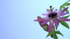 A close-up of a purple flower with a dark center and green leaves against a blue sky. | passiflora. timelapse of flower blooming on blue background - stock footage | 0fa224df105d59ce0833e59ba66307f6371d88fbfd6019bd7d049dbf5976252e | 001229741984 | 0 | 0 | 17 | 11 | 0 | 0 | |
