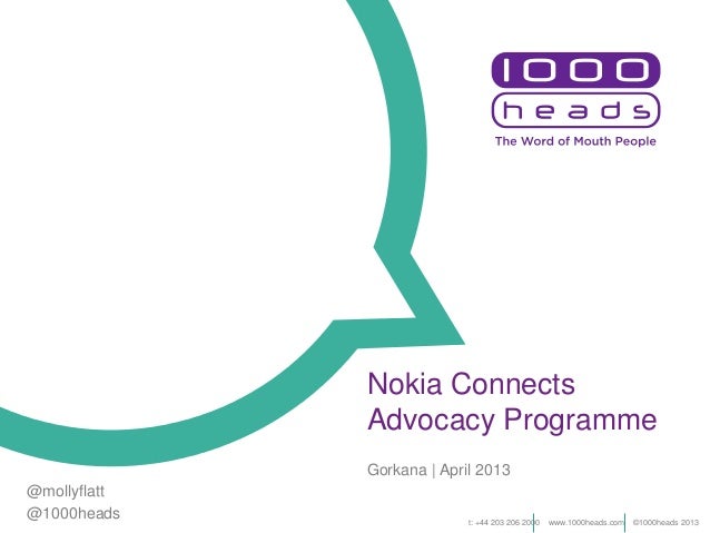A white circular graphic with a teal border is centered on a purple background. The graphic has a large white circle in the center, with a smaller teal circle inside it. The text '1000 HEADS' is written in a stylized font above the graphic, and 'THE WORD OF MOUTH PEOPLE' is written below it. The text 'MOLLY FLATT' is written in the bottom left corner, and 'GORAKNA APRIL 2013' is written in the bottom right corner. | Nokia ConnectsAdvocacy ProgrammeGorkana | April 2013t: +44 203 206 2000 www.1000heads.com \xc2\xa91000heads 2013@mollyflatt@1000h... | 23a804ed9fa2119c0885418f2bfe313a1f125f3f811ca42bcb797a2ab76de45b | 001229741989 | 0 | 0 | 76 | 13 | 0 | 0 | |