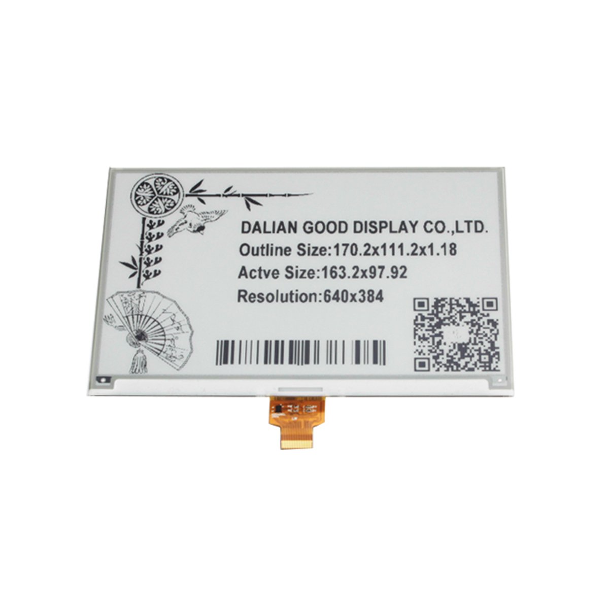 A white electronic display with a black border and a QR code in the bottom right corner. The display has a decorative design with a bird and a fan on the left side, and a text label that reads 'DALLAN GOOD DISPLAY CO. OUTLINE SIZE: 17.2*1.72*1.01 ACTIVE SIZE: 16.5*1.65*0.99 RESOLUTION: 640*480'. | GooDisplay E-Paper Screen Eink Display Electronic Paper Display Panel 7.5 Inch Black and Write 640384 Resolution SPI Interface | a682b580658d23e265eccc2768caec51926c38f7e8b47ffe5ac0d8ac1f7f04ab | 001229741900 | 0 | 0 | 51 | 18 | 0 | 0 | |