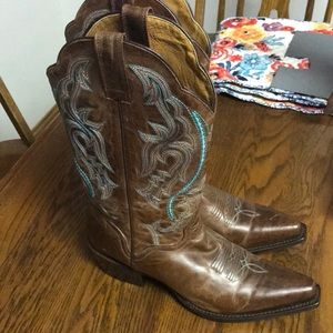A pair of worn cowboy boots with intricate designs on the sides and a brown leather finish. The boots are placed on a wooden floor, and there is a floral-patterned cloth draped over a chair in the background. | Cowgirl Boots | 05bdf9f9eeda3d1e4a75ff309e874300d48d6781af2fd407145c49dad0d0a4d3 | 001229742340 | 0 | 0 | 38 | 2 | 0 | 0 | |
