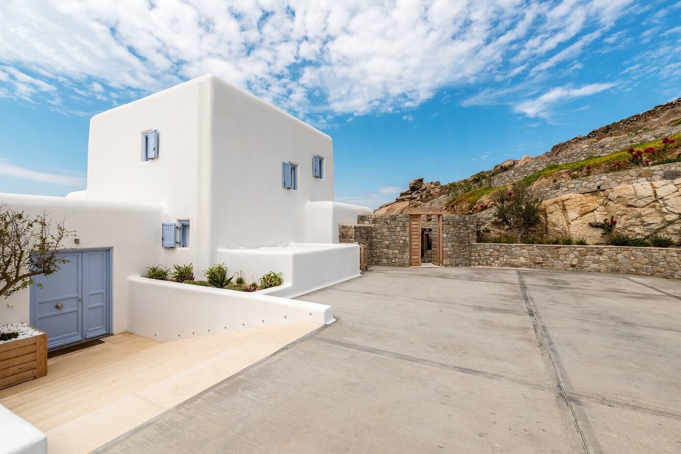 A traditional Greek house with white walls and blue doors and windows is surrounded by a stone wall and a wooden deck. The house has a flat roof and is situated in a rural area with a clear blue sky and fluffy white clouds above. | Infinite Blue Villa by Mykonos Architects | 52bd0aaefeab4aa786d526b169d8a51e8202971967bda9354102817c465071a3 | 001229742380 | 0 | 0 | 45 | 6 | 0 | 0 | |