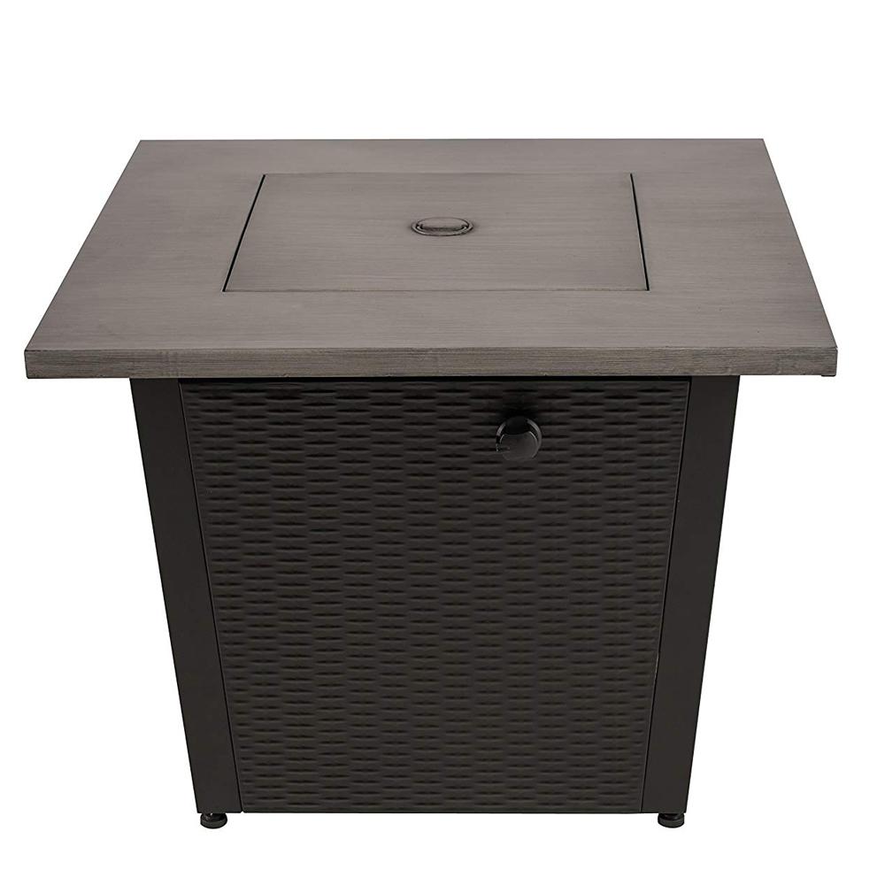 A modern, rectangular, black metal table with a wicker texture and a flat top. The table has a single, round, black metal handle on the right side and a circular, black metal drain in the center of the top. | 32 in. W x 25 in. H Square Steel Wicker Base Propane Fire Pit with Table Top in Grey | 6630222da8389b4ca3a670ab195efbeec889e331a66714bb3b219d99406cbdf9 | 001229742437 | 0 | 0 | 39 | 19 | 0 | 0 | |