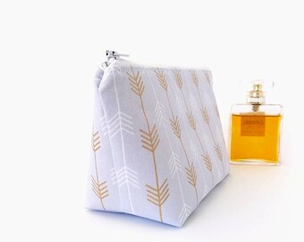 A white fabric handbag with a golden leaf pattern is placed on a white background. Next to the handbag, there is a clear glass bottle with a golden liquid inside. | Bridesmaid gift, Makeup bag arrows, Makeup pouch, Make up bag, Makeup zipper pouch, Gold arrow makeup bag, Arrows pouch, Small cosmetic bag | 8328bc8f4fbae53d0071ebcd398155f10bf5f8b46edfece270fdfa636b0b5b88 | 001229742406 | 0 | 0 | 30 | 22 | 0 | 0 | |
