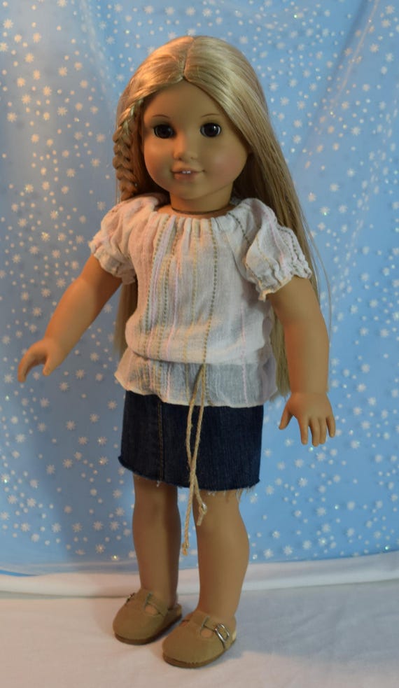 A doll with blonde hair wearing a white and blue striped shirt, denim shorts, and brown shoes is standing on a white surface with a blue and white patterned background. | Cutoff denim skirt and belted peasant/tunic top for American Girl Julie | e5d16dbcdf598994b998048f3df3c196669d03356ad1a31ddfe27107f4411de9 | 001229742353 | 0 | 0 | 30 | 11 | 0 | 0 | |