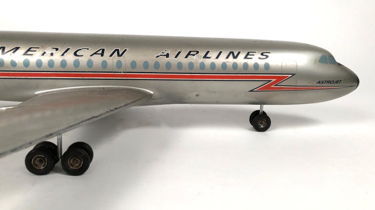 A silver toy airplane with the words 'American Airlines' written on the side is displayed on a white background. The airplane has a red and blue stripe running along its body and a red and blue tail fin. It has two wheels under the front of the plane and a small wheel under the tail. | Vintage American Airlines Astrojet Aviation Model For Sale 4 | 4cdc1e0e370b15e88a3c80ff744e7d302f32c3f52477b34d9783325f5305ff1d | 001229742574 | 0 | 0 | 55 | 9 | 0 | 0 | |