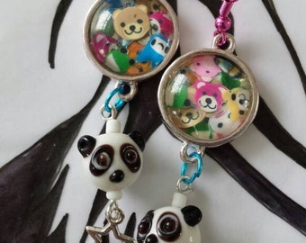 A pair of white and black panda bear charms with black eyes and a pink nose, each attached to a silver ring, are hanging from a pink cord. The charms are set against a white background with a black and white panda bear illustration. | Sale was 12 now 10uk Silvertone Round Cabochon Cute Cartoon Animal earrings with Glass Panda dangles. | a716acd1e790dc2fc416c5d1f54d1bab8f858d676463c7b98bfd4d4a8d299dec | 001229742530 | 0 | 0 | 44 | 16 | 0 | 0 | |