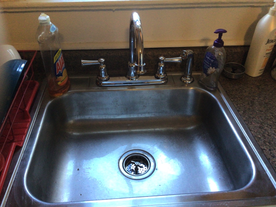 A stainless steel kitchen sink with a single faucet and a drain in the center. The sink is empty and clean, with no dishes or utensils inside. There are various cleaning supplies on the countertop around the sink, including bottles of dish soap, hand soap, and a sponge. The countertop is made of a dark material, and the overall scene is well-lit with natural light. | Replaced kitchen faucet, all piping and valves under kitchen sink In Asbury Park | 75a0295a981454e47c4b6310515010fb660f2804e846253b41dfe58f8d7ff88f | 001229742462 | 0 | 0 | 65 | 13 | 0 | 0 | |