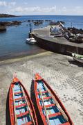 A serene harbor scene with two red boats docked on a cobblestone pier. The water is calm, and the sky is clear with a few clouds. In the background, there are several boats moored in the harbor, and a small building is visible on the right side of the pier. | Small harbour of ribeiras in pico island, azores Stock Photos | d1b9724275532bcce26f9d37eddb7e32dce03b541cc136b118d12689fe17934d | 001229742587 | 0 | 0 | 50 | 10 | 0 | 0 | |