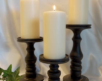 Three white candles with lit flames are placed on a black candle holder with a decorative base. The holder has a circular base and a tall, slender column with a fluted design. The candles are evenly spaced, with the leftmost candle being the shortest, the middle candle being the tallest, and the rightmost candle being the shortest. The background is a plain, light-colored fabric. | Primitive Black Pillar Candle Holder Set of 3 - Lathe turned - Made in USA | 045f2d680eaa4be693d7b442d08582e0b003935a548c286f3b9618a9f7ccfec5 | 001229742687 | 0 | 0 | 64 | 15 | 0 | 0 | |