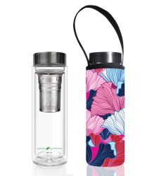 A clear glass bottle with a green label and a black cap is placed next to a black water bottle with a floral pattern. | Tea Flask Glass Is Greener + Carry Cover | Fan Print | f618287e6ce0c128d944b19a7aaa8bf47f8cffc0d527f87f4461912598c6102e | 001229742643 | 0 | 0 | 24 | 11 | 0 | 0 | |