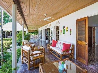 A modern porch with a wooden ceiling and a tiled floor, featuring a wooden dining table with a glass top, surrounded by four chairs with white cushions. The porch is adorned with a variety of colorful and whimsical decorations, including a large, colorful floral painting on the wall, a wooden door with a glass window, and a wooden cabinet with glass doors. The porch overlooks a lush garden with greenery and a small building in the distance. | Luxury Montego Bay Rental Home Luxury Throughout | 38e20e28fad7e8f1659546177c681ac11728193ec7a402624db50b11a8088b4e | 001229742674 | 0 | 0 | 77 | 7 | 0 | 0 | |