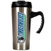 A silver travel mug with a black handle and a black lid, featuring a logo of a black bear with the words 'Timberwolves' and 'Minnesota' in green and white, respectively. | Minnesota Timberwolves 16oz Stainless Steel Travel Mug | 34b50c3f1e8ce933e88cb1ae1f785da657ffcd10a876ff3ec5dcfaa0fcbcabc9 | 001229742732 | 0 | 0 | 30 | 7 | 0 | 0 | |