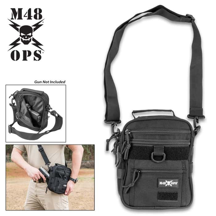 A black tactical bag with a skull and crossbones logo on the front is being worn by a man. The bag has multiple compartments, including a main compartment with a zipper closure, a smaller pocket with a zipper, and a phone pocket on the front. The bag also has two adjustable shoulder straps and a waist strap. The man is wearing a beige shirt and khaki pants, and he is holding a gun in his right hand. The background shows a plain wall with the text 'M4 8 OPS' and a skull and crossbones logo. | M48 Sentinel Compact Concealed Carry Pistol Sling Pack - Canvas Construction, Secures Two Pistols, Accessory Pockets, Removable Shoulder Strap | 75cd76e520ed5d57e1c42c161b0febe2ded5d7a1e666c4af3916fae03aa2641e | 001229742765 | 0 | 0 | 95 | 19 | 0 | 0 | |