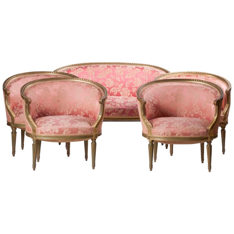 A set of four antique Victorian-style armchairs with ornate wooden frames and plush pink upholstery is arranged in a semi-circle. The chairs feature intricate carvings and gold accents, with each armchair having a matching footstool. The set is displayed against a white background. | French 5-Piece Louis XVI-Style Sofa Set with Carved Ribbons 19th Century | b229718bff44e8c2155786a0d84d6d0408566295b287a4671b7a7fd9f6546bfd | 001229742868 | 0 | 0 | 43 | 11 | 0 | 0 | |