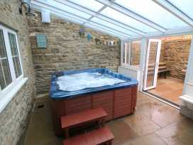 A modern indoor swimming pool with a blue cover is situated in a room with a stone wall and a glass ceiling. The pool is surrounded by a wooden deck with a red table and bench. There is a stone floor and a window on the left side of the room. | Belgrave House - Yorkshire Dales - 932899 - thumbnail photo 9 | 5872448fe74e2b9c65b5dacebe160b6d058174db894ef5a0afb9e8a3eb9f422a | 001229742950 | 0 | 0 | 51 | 11 | 0 | 0 | |