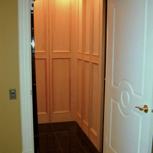 A wooden door with a white frame is open, revealing a hallway with wooden paneling on the walls and a black tiled floor. The door has a brass doorknob and a blue light switch on the wall to the left. | Home elevators | ea5f292ac19968d39fe8e56e9fec5ff6d851e102e5dd9ee7f6b0480228c528c1 | 001229742901 | 0 | 0 | 40 | 2 | 0 | 0 | |