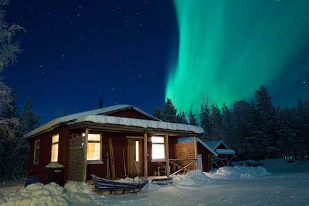 A small red cabin with a snow-covered roof is surrounded by a snowy landscape. The night sky is filled with stars and the aurora borealis, casting a green glow over the scene. The cabin has a small porch with a wooden bench and a chair, and there is a wooden fence in the foreground. | G\xc3\xa4st-stuga in Paksuniemi, 7km from Icehotel - Paksuniemi | 04750b4459089bc0f787f10998dc05c4f4347e19b40c48f52574043e02aae054 | 001229743012 | 0 | 0 | 54 | 8 | 0 | 0 | |