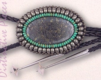 A close-up of a silver and turquoise beaded necklace with a large, textured turquoise stone pendant. The beads are arranged in a circular pattern with a mix of silver and turquoise colors. The necklace is accompanied by two silver earring backs, one on each side of the image. The background is a plain, light-colored surface. | Chalcopyrite withTurquoise and Pyrite Bolo Tie - Men or Women's Bolo, Vintage Pawn Look, Southwestern Style, Large Santa Fe Bolo, BO3458056 | 66aed6f1b804a02c249eee633d6a8871f64bf7c4808fdce94a2a8149e6fea933 | 001229742257 | 0 | 0 | 55 | 21 | 0 | 0 | |