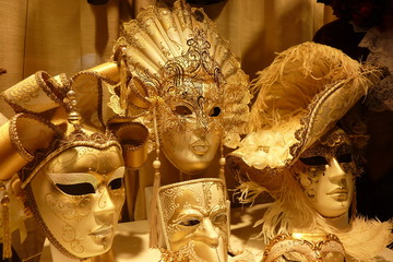 A collection of ornate, gold-plated Venetian masks is displayed on a wall. The masks are intricately designed with various patterns and embellishments, including feathers and lace. They are arranged in a way that showcases their detailed craftsmanship and the variety of designs. | Traditional venetian masks | 1bf6e9114a7a84e2277d1657d81fbfbc0cdb813ee867b8917810e7b57656ffab | 001229743045 | 0 | 0 | 42 | 3 | 0 | 0 | |