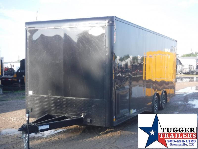 A black and yellow trailer is parked on a dirt ground. The trailer has a black exterior with a yellow stripe running along the bottom and a yellow door on the right side. There is a logo on the bottom right corner of the trailer. The ground is wet, and there are puddles around the trailer. In the background, there are other trailers and a building. | 2019 Cargo Mate 8.5x24 24ft NS Enclosed Cargo Auto Mobile Car / Racing Trailer | 426003481960e5b2d1d60fca96e3204a54a2c75f52ed982bbeb17c6b1a3752b7 | 001229743438 | 0 | 0 | 66 | 14 | 0 | 0 | |