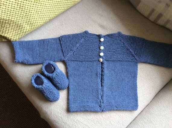 A blue knitted sweater with a round neckline and buttons is laid out on a grey couch. Next to the sweater, there is a pair of blue knitted baby shoes with a button on the front. The sweater and shoes are placed on a surface with a green and yellow striped cushion in the background. | Hand knitted newborn baby coming home outfit in soft cotton acrylic mix comprises bonnet or hat jacket and dungareesoveralls | 5f8c8f6246aae230670deb105900a03e0af8310bbbf19982510e5afe7a8a0ba6 | 001229743496 | 0 | 0 | 55 | 19 | 0 | 0 | |