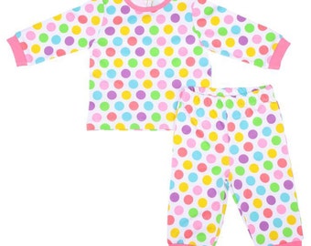 A child's outfit consisting of a long-sleeved top and matching pants, both covered in a colorful polka dot pattern. The top has a pink collar and cuffs, while the pants have a pink waistband. The outfit is predominantly green with pink, yellow, and blue polka dots. | Polka Dot Baby girl pajama set, organic cotton -newborn - toddler girl-baby gift (size 0-24 month)-Fun girl- | aa0604c2dd21d8d48f7dd6a6a9d6cff25ccbaaf64d54dff09d6817c5896fa12d | 001229743440 | 0 | 0 | 46 | 17 | 0 | 0 | |