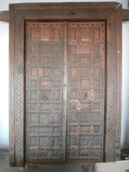 A large, ornate wooden door with intricate carvings and metal accents is closed, with a visible hinge on the left side. The door is set within a frame that extends to the top and bottom of the image, and the surface it is mounted on appears to be a wooden floor. | Really old spanish handcarved front doors with frame | b601471c1c9ae574d95fa10bf61065b5e9db5ca86ba92a33b5b83f42a245410b | 001229743536 | 0 | 0 | 51 | 8 | 0 | 0 | |