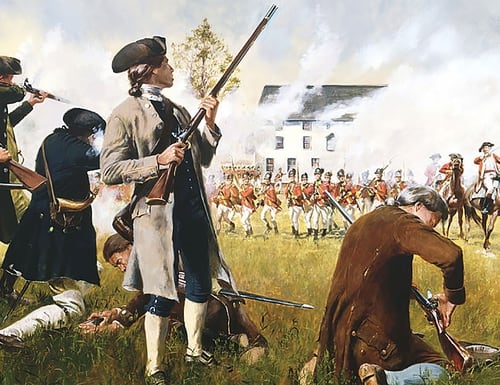The first image depicts a historical painting of a military scene with soldiers in colonial American attire. The central figure is a standing soldier with a musket, wearing a tricorn hat, a blue coat with gold buttons, and white breeches. He is looking to his left, and there is a smoke effect in the background, suggesting a battle or military action. To the left of the central figure, another soldier is kneeling, holding a rifle, and looking towards the central figure. In the background, there is a group of soldiers in red coats, possibly British, and a building with smoke coming from it. The overall color palette is dominated | At 5:00 am on April 19, 1775, about 700 British troops marched on a weapons cache in Lexington, Massachusetts \xe2\x80\x94 a move that sparked America's war for independence. | ccadca1fb3e92a4af535582efc01d0ffdc7686342869d6c3945a9f615d7adcd7 | 001229743432 | 0 | 0 | 109 | 28 | 0 | 0 | |