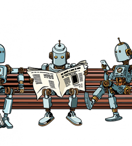 A group of three robots is sitting on a wooden bench. The robot on the left is holding a newspaper with its right hand, while the robot in the middle is holding a smartphone with its right hand. The robot on the right is holding a newspaper with its left hand. All three robots have a similar design with a metallic body, large round heads, and visible joints. They are wearing shoes and are positioned in a way that suggests they are reading or looking at their devices. | bots sitting on bench | ddae041ae7ac9566b9fbfe0c3b0bbf05b4f3bd84c533ab21d64528b8e42f56a9 | 001229743471 | 0 | 0 | 88 | 4 | 0 | 0 | |
