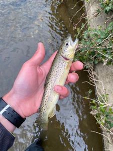 A person is holding a fish in their hands, with the fish's head visible and its body extending towards the person's palm. The person is wearing a black wristwatch on their left wrist and is standing in a body of water, possibly a river or stream. The water is murky, and there are some plants visible in the background. | Brown Trout | ecc015aaa82ed40b5becdd6ef3235fe6b8c9c0ee17967fceab39f8b7b0ce5837 | 001229743739 | 0 | 0 | 59 | 2 | 0 | 0 | |