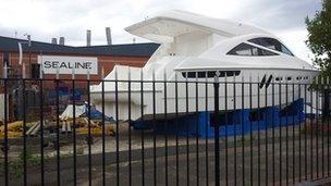A white boat with a blue stripe is parked in front of a building with a sign that reads 'SEALINE'. The boat is partially covered by a white canopy, and there is a blue fence in front of it. The scene appears to be in a marina or boat storage area, with other boats and equipment visible in the background. | Sealine factory in Kidderminster | 76236c50bf60b846a67eb0b436aec95f4477a0660e2f8ebf5f538896e97480b0 | 001229743816 | 0 | 0 | 60 | 4 | 0 | 0 | |