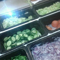 A variety of fresh vegetables are displayed in clear plastic containers on a supermarket shelf. The containers are filled with green lettuce, sliced cucumbers, and chopped onions. The lettuce is in the top left container, the cucumbers are in the middle left container, and the onions are in the bottom right container. The containers are placed on a shelf with a reflective surface, and there is a blurred background with other food items. | Photo taken at Subway by Diallo J. on 6/26/2012 | af16347dd713b774e17600613ace828c7d483a01b32ed4a828125fe9eda72820 | 001229743821 | 0 | 0 | 73 | 9 | 0 | 0 | |