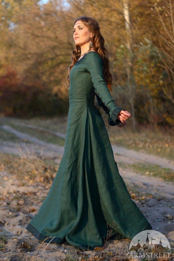 A woman in a green dress is standing on a dirt path with trees and foliage in the background. | Medieval Gowns and Dresses for Women | efef7559f256bfbfb316448a0cab5723bfc18881d0b839807511d318a6f3a92f | 001229743796 | 0 | 0 | 19 | 6 | 0 | 0 | |