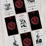A set of six playing cards with a gothic theme is laid out on a white surface. Each card features a different design with a central red symbol surrounded by black borders. The designs include a demon, a knight, a dragon, a unicorn, a phoenix, and a knight on a horse. The cards are arranged in two rows of three, with the top row showing the demon, knight, and dragon, and the bottom row showing the unicorn, phoenix, and knight on a horse. | Occult Tarot | 745e4d224249d71ae719ceccfe4a8d861a97c04dbd443a28008f5abc5b471006 | 001229719892 | 0 | 0 | 83 | 2 | 0 | 0 | |