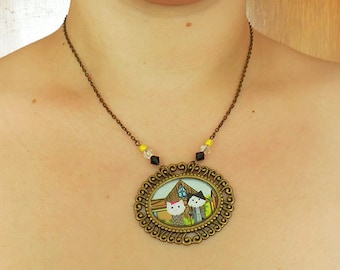 A person is wearing a necklace with a circular pendant featuring a cartoon house and two cartoon characters standing in front of it. The pendant is surrounded by a decorative border with a pattern of concentric circles and lines. The person is wearing a dark necklace chain that is not visible in the image. | American Gothic - Grant Wood. Necklace. Cameo | 1e5f53f87d9d069ec75261443c0a25aee24fe6071077a08ea36bf8f1396b9734 | 001229744112 | 0 | 0 | 54 | 7 | 0 | 0 | |