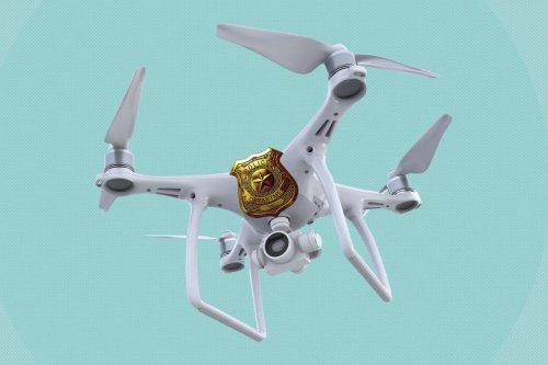 A white drone with four propellers is hovering in the air against a light blue background. The drone has a badge on its front, which is centered and slightly tilted upwards. The badge features a lion's head with a crown, and the word 'POLICE' is written above it. The drone's body is predominantly white with some black details, and the propellers are also white with black tips. | The California City That Sends a Drone Almost Every Time Police Are Dispatched on a 911 Call | 324de3ce00cb551052b3610afd9599d9e5abc22330747706df9f30614e967d89 | 001229744136 | 0 | 0 | 67 | 17 | 0 | 0 | |
