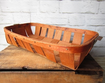 A wooden boat-shaped basket with a flat bottom and vertical slats on the sides is placed on a wooden surface. The basket has a natural wood finish and is positioned against a white brick wall. | Sturdy Vintage Gathering Basket - Orchard Basket Fruit Basket - Market Basket | 6c1fc62a1a896e7b1000bc79cd7b517488a17d1b15898c82acc13be5cd5374d0 | 001229743847 | 0 | 0 | 35 | 12 | 0 | 0 | |