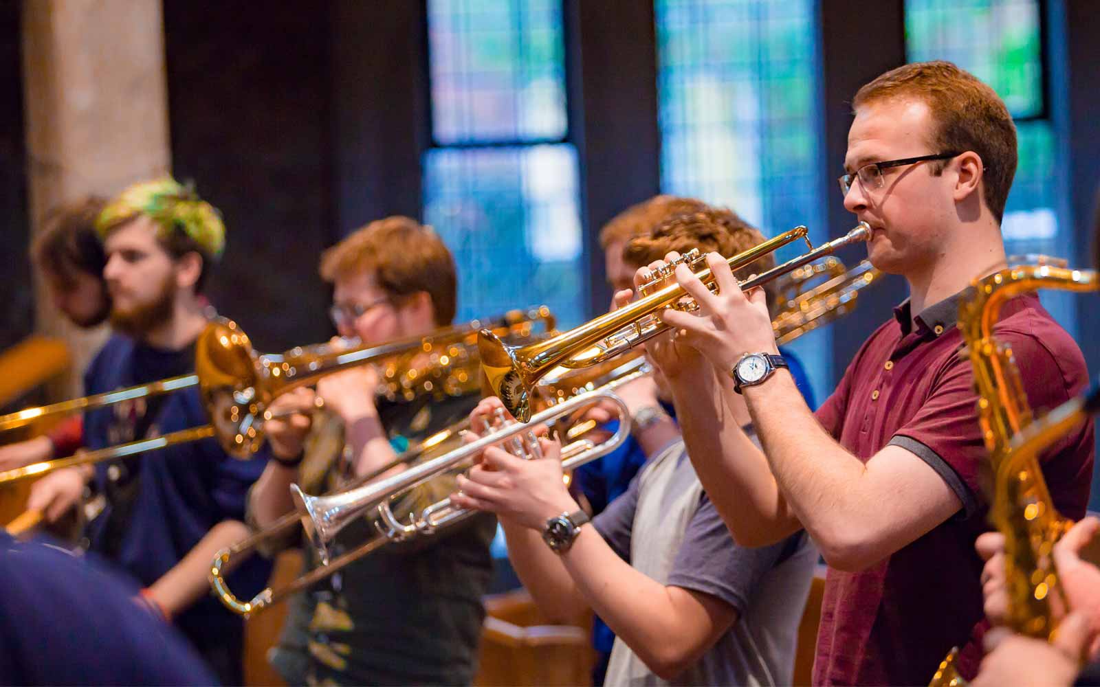 A group of people playing brass instruments in a church setting. The individuals are wearing glasses and are dressed in casual attire. The instruments include a trumpet, a trombone, and a French horn. The setting appears to be a church with stained glass windows and a wooden interior. | A group of students play brass instruments together in the university chapel. | 29e530c02ecf61f2a1b32754da94cd4f1de34072e78b8e42cf4df478ede6565c | 001229744095 | 0 | 0 | 48 | 12 | 0 | 0 | |