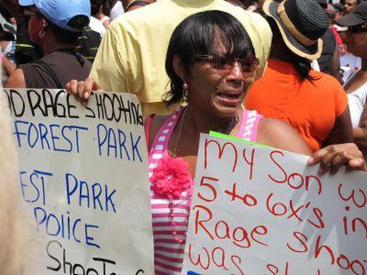 A woman is holding a protest sign with a pink flower on it, which reads 'MY SON 5 TO 6 X'S IN RAGE SHOOTING WAS WORSE THAN 6 X'S IN RAGE SHOOTING IN FOREST PARK'. She is surrounded by a crowd of people, some of whom are also holding signs. | In this Saturday, July 20, 2013, photo, Patricia Dorsey of Cincinnati cries during a rally in downtown Cincinnati protesting the acquittal of George Zimmerman in the shooting death of Trayvon Martin. | 933b1712bc5fc350edc7171fe841ef583960b7d10619d4a3bc58153d30c61717 | 001229744147 | 0 | 0 | 50 | 31 | 0 | 0 | |