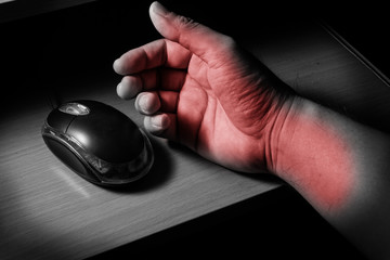 A hand with a red glow on the wrist and forearm is resting on a wooden surface next to a black computer mouse. The hand is positioned as if it is about to move the mouse. The red glow is intense and covers a significant portion of the wrist and forearm, creating a striking contrast with the dark background. | Trigger Finger or Carpal Tunnel syndrome. | b6d8886ccf767904dc0695a8ca533d4efe543e31060c777996eb390ecef86f21 | 001229744240 | 0 | 0 | 59 | 6 | 0 | 0 | |