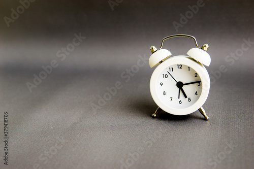 A white alarm clock with a black face and black hands is displayed against a grey background. The clock has a small, round white face with black Roman numerals and a black minute hand and hour hand. The clock is set to approximately 10:10. The alarm button is white with a black border, and the clock has a small, round white base with a black border. | White alarm clock on a gray background. Empty space for text. Wallpaper Mural | ed9f0f46bcc27d5fd84d6f5c3bc399c352e3dcf4ac6094be24fb8debad4b90fe | 001229744341 | 0 | 0 | 66 | 13 | 0 | 0 | |