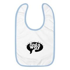 A white bib with a blue trim around the edges and a stylized 'Find a Way' logo in the center. The logo features a speech bubble with the words 'Find a Way' inside it, and the phrase 'Find a Way' is written in a circular pattern around the speech bubble. The bib has a soft, smooth texture and appears to be made of a lightweight material. | 1004 Embroidered Baby Bib | b2af19e535f7b542e281db69ba83e768b4b923c0b62ac8cab526183b1df6c5d3 | 001229744384 | 0 | 0 | 66 | 4 | 0 | 0 | |